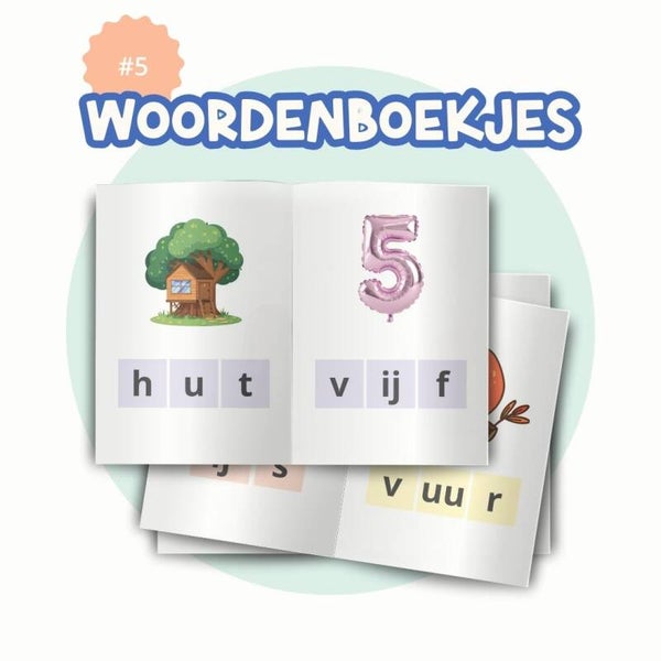 Toont jouw kleuter interesse in letters, maar wil je géén werkbladen of druk leggen op leren lezen? Deze miniboekjes bevatten 21 korte, herkenbare woordjes die jouw kind zélf kan leggen met bijvoorbeeld magneetletters.